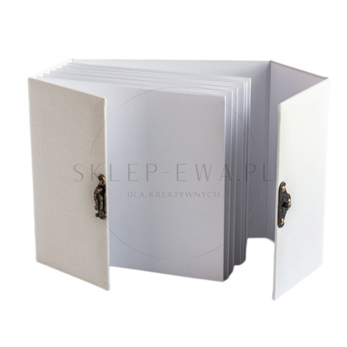 Elegancki album do scrapbookingu z białym płótnem i zapięciem. 6 grubych kart 250g, format 16x16,3 cm, ręcznie wykonany przez Eco Scrapbooking. Idealny na pamiątki ślubne, komunijne i do kreatywnych projektów DIY.