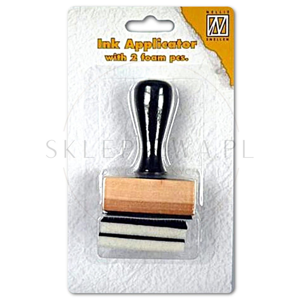 Aplikator drewniany do tuszu, prostokątny. Wygodna rączka ułatwia pracę. Wymienne, piankowe podkładki, przyczepiane są na rzep. W zestawie znajdują się dwa piankowe wkłady.