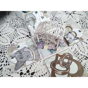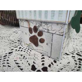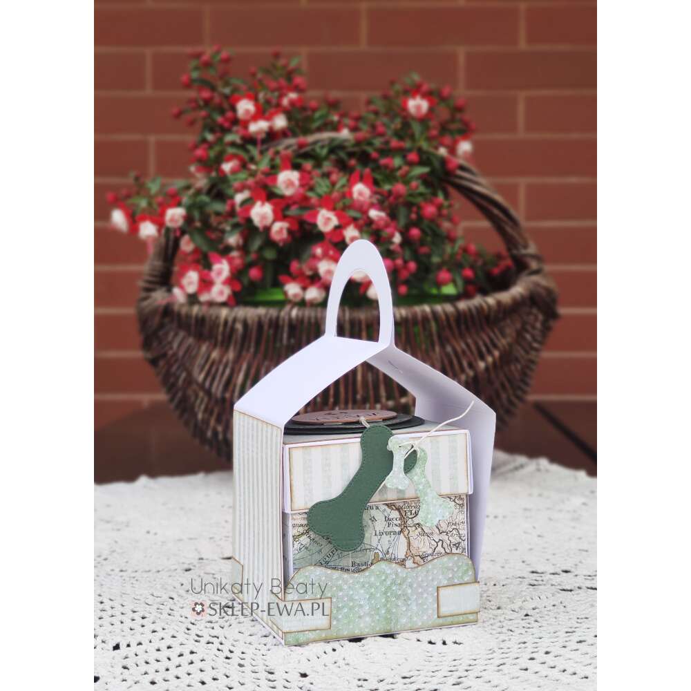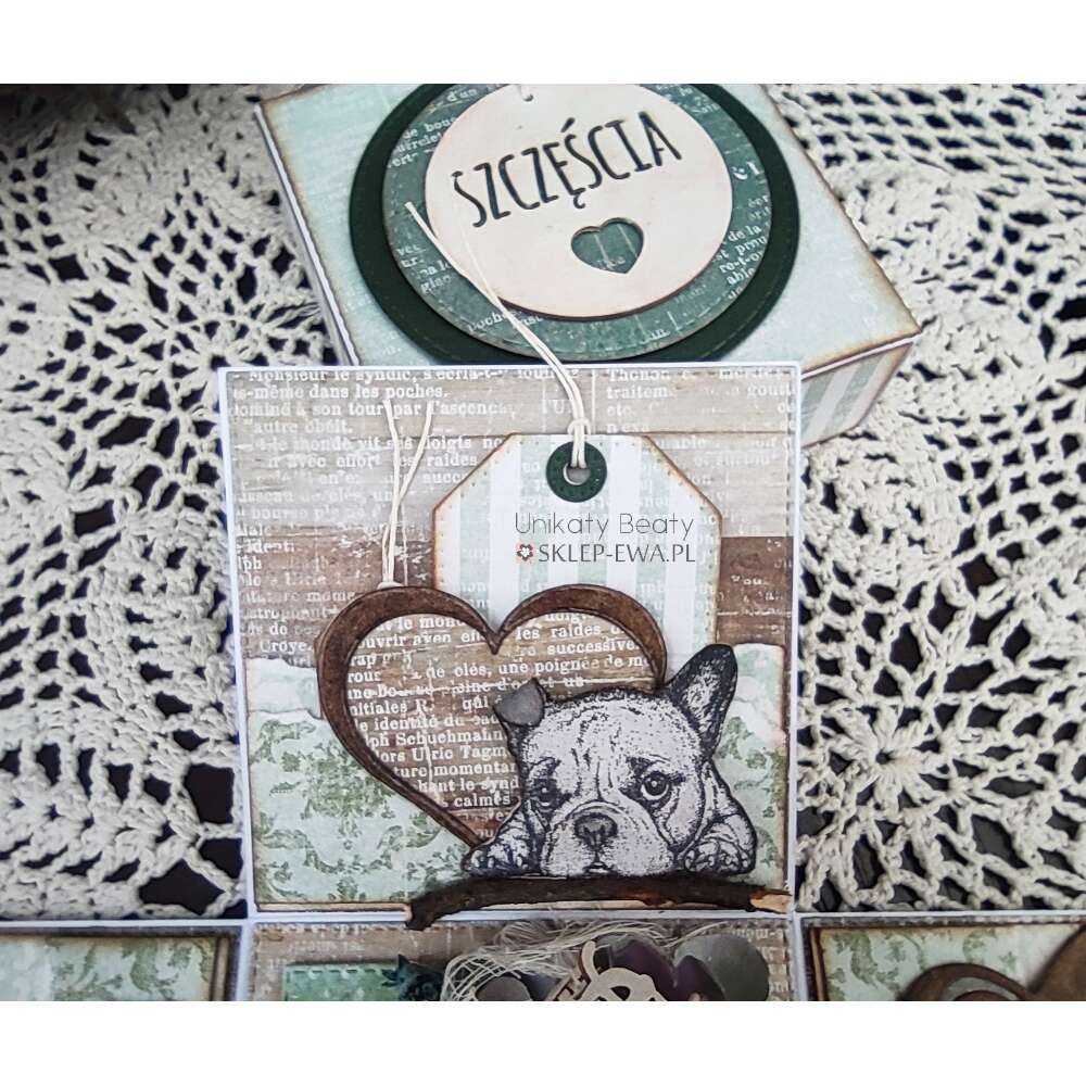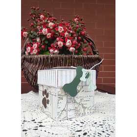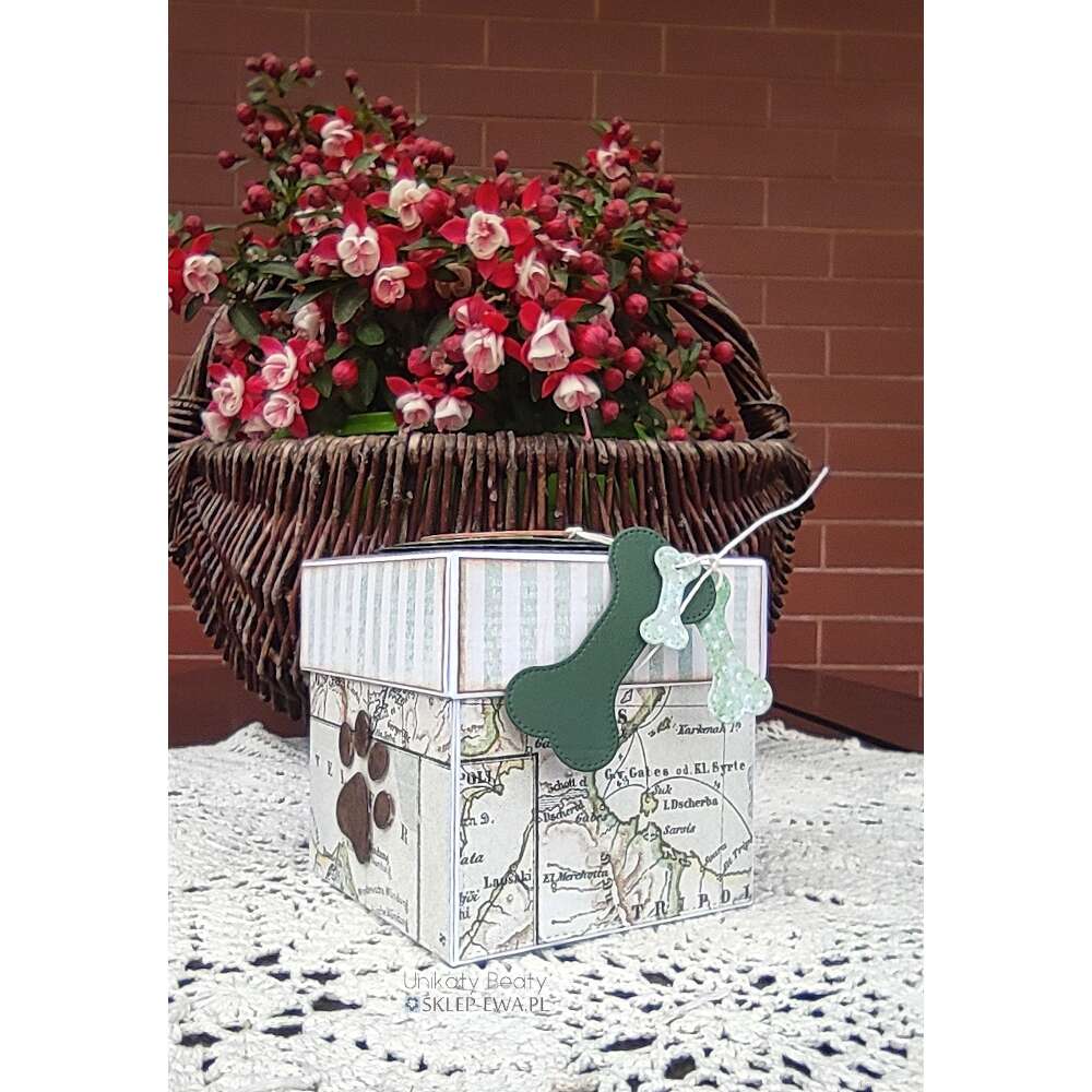 Ślub to okazja do podarowania czegoś wyjątkowego Młodej Parze. Zwłaszcza że owa Para Młoda jest bardzo bliska mojemu sercu, albowiem ślubował mój syn. Obydwoje bardzo lubią podróże, więc wybrałam kolekcję Enola Holmes od UHK Gallery, gdzie na arkuszu Escape występuje piękna mapa. Umieściłam ją na zewnątrz pudełka, aby była od razu widoczna. Młodzi mają dwa buldożki francuskie — Kobiego i Bonnie. Psiaki pięknie zdobią ścianki exploding boxa. Dodatkowe psie akcenty to ślad łapki na zewnątrz boxa i kości z papieru przywiązane za pomocą sznurka.