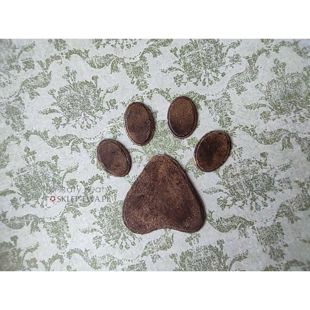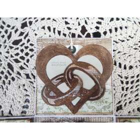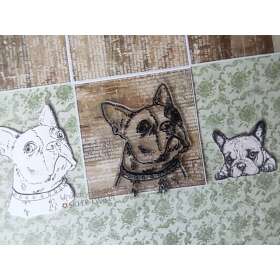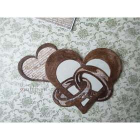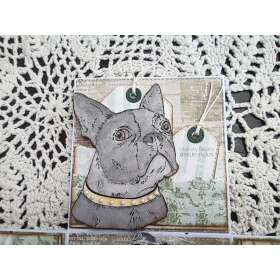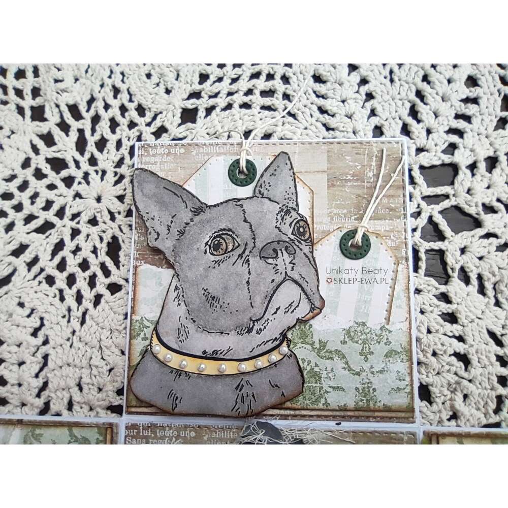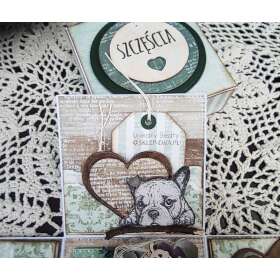Poniżej parę wskazówek krok po kroku. Serca i ślad łapy wycięłam wykrojnikiem z białego papieru. Pomalowałam je brązową farbą akwarelową, potem przetarłam pastą antyczną, co dopasowało je do użytego papieru. Serca i obrączki podkleiłam innym papierem, co daje efekt trójwymiarowości. Buldożki francuskie odbiłam za pomocą stempli i później pokolorowałam szarą farbą akwarelową.