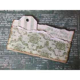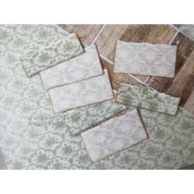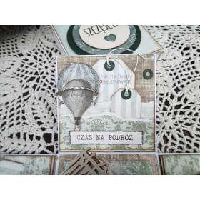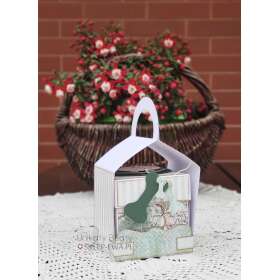 Kieszonki na tagi ozdobiłam przedarciami i wytuszowałam. Kieszonki nakleiłam w taki sposób, aby w środek zmieścił się tag i nie przeleciał na wylot. Na tagach umieściłam wewnątrz krótkie życzenia. Dziurki na tagach zabezpieczyłam zielonymi kółeczkami, co dodatkowo jest elementem zdobniczym. Przez nie przedziałam biały lniany sznurek, który ułatwia wyciąganie. Wszystkie elementy na ściankach przykleiłam na kostkach 3D. Na każdą kosteczkę daję kroplę kleju. Daje mi to gwarancję, że po latach żaden element nie odpadnie. Poza tym umieszczając przyklejany element na kartce łatwo go przesunąć.