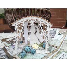 Pośrodku boxa umieściłam altankę boho. Pomalowałam ją leciutko na biało i popsikałam złotą transparentną mgiełką. Wokół przykleiłam kwiaty i borówki. Pod spód dałam poszarpaną gazę, która dodatkowo co nieco zasłoniła. W środku wkleiłam Parę Młodą z papieru. Wycięłam dwie takie same Pary Młode i przykleiłam na siebie z lekkim przesunięciem. Ten zabieg wzmocnił cały element. Jedną ze ścianek ozdobiłam balonami wyciętymi z arkusza Enola Holmes oraz napisem: "Czas na podróż". Nowożeńcy zaraz po weselu ruszają do Włoch, ale podróż to zarazem taka przenośnia. Małżeństwo bowiem to nowa podróż trochę w nieznane. Nowa rodzina, nowe wyzwania razem, nowa droga…