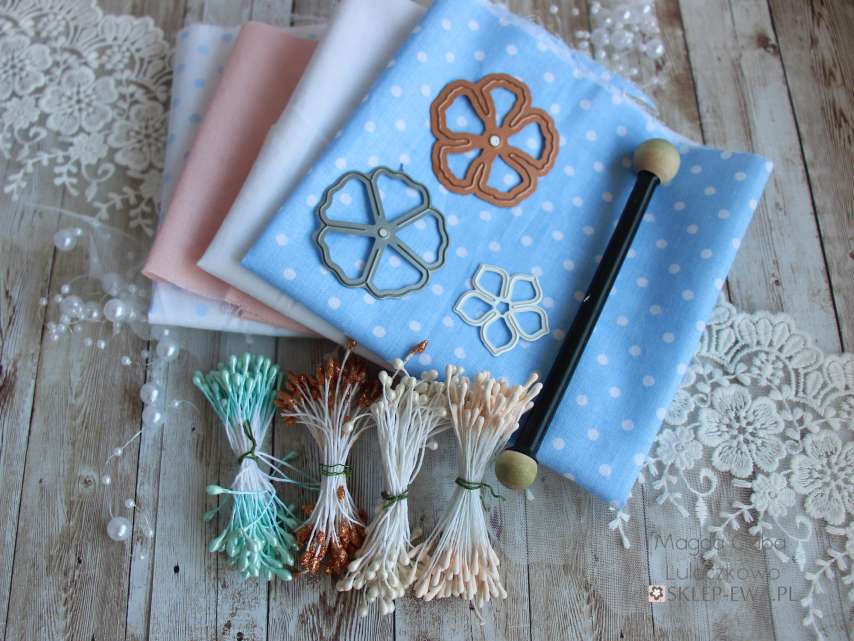 Nie mam zbyt dużego doświadczenia w ich tworzeniu, ale podjęłam kilka prób i wiem już, że wystarczy nam zwykła tkanina bawełniana. Jednak bawełna z natury jest dość miękka, więc zanim zaczniemy wycinać z niej płatki warto ją usztywnić np krochmalem. Ja płatki formuję na gąbeczce, delikatnie smarując je pędzelkiem zamoczonym w krochmalu, a następnie formuję dłutkiem, jednocześnie susząc nagrzewnicą. Całość sklejam, klejem na gorąco. Kwiatuszki stają się wtedy dość sztywne i nie odkształcają się.