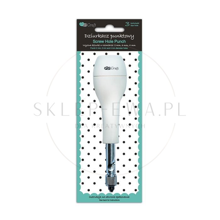Dziurkacz punktowy wykonujący otwory o średnicy 2 mm, 3 mm i 4 mm. Służy do wykonywania otworów w papierze, kartonie, kalce, cienkim plastiku, piance, filcu, skórze i w wielu innych materiałach. Narzędzie sprawdzi się w cardmakingu, scrapbookingu. Wymienne końcówki umieszczone są w główce dziurkacza, nie zgubisz ich i będą zawsze pod ręką.
