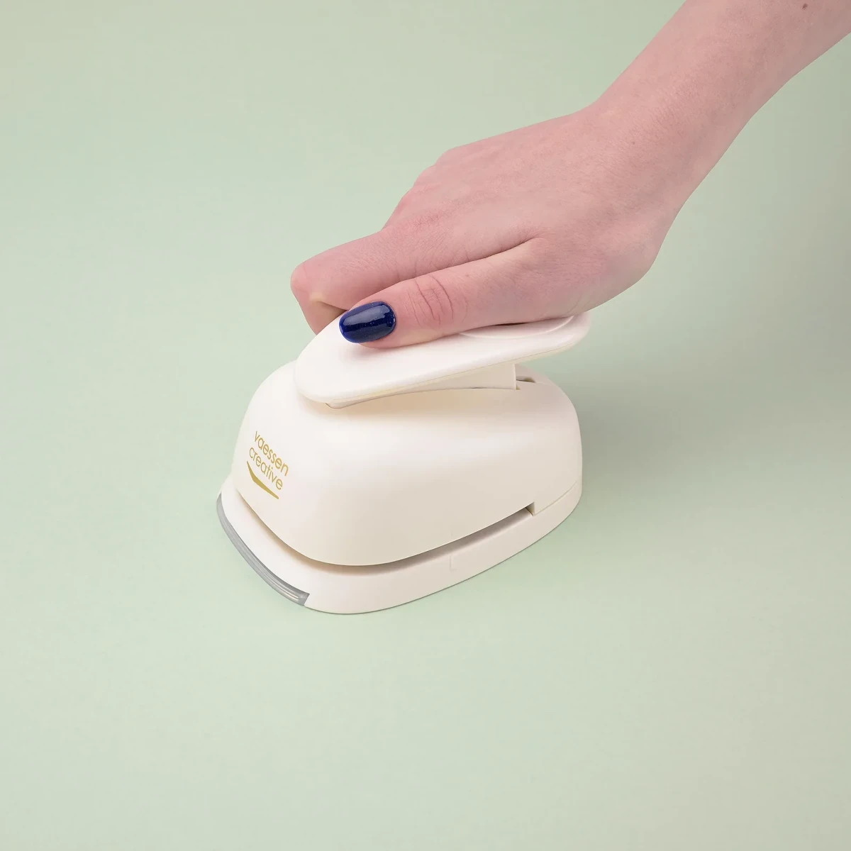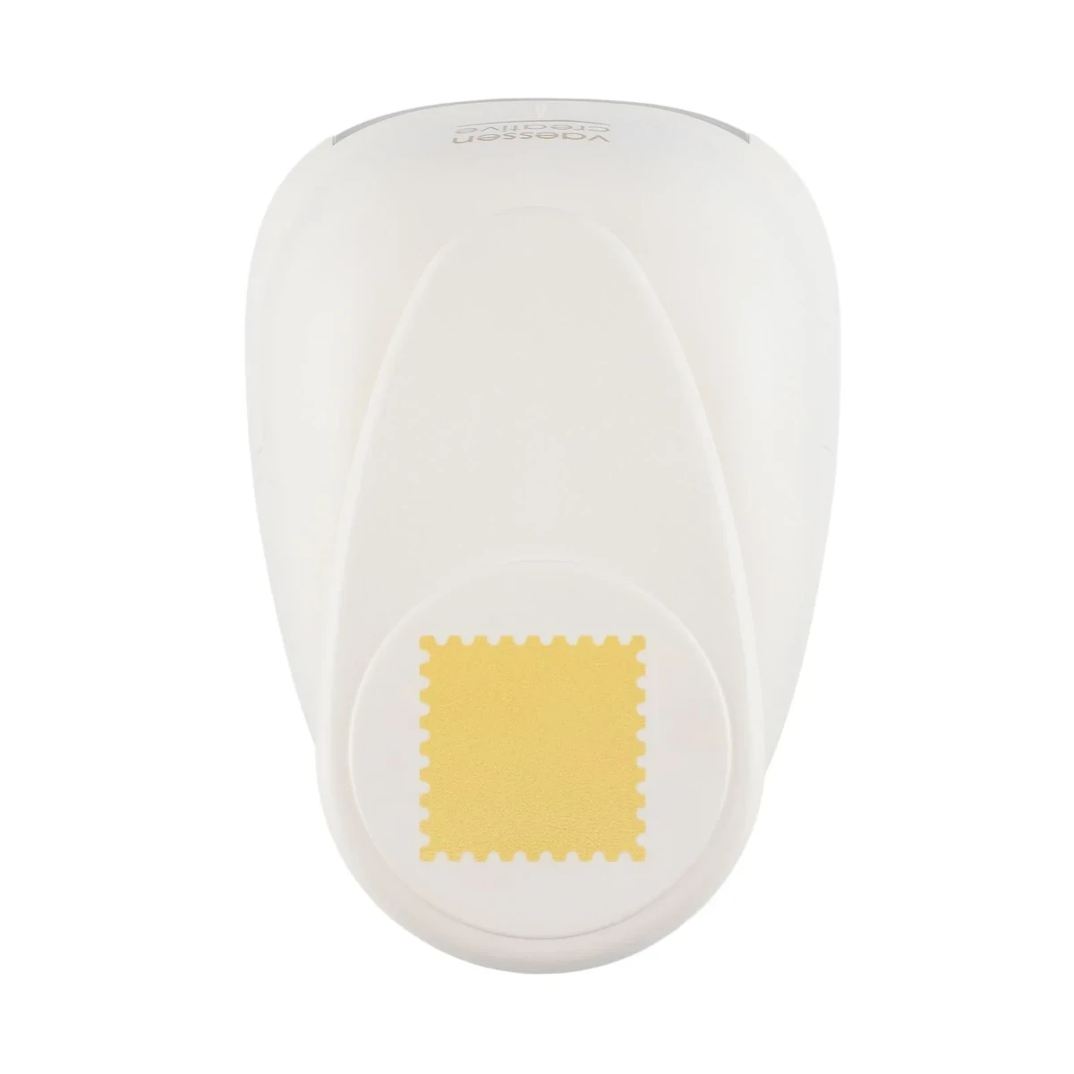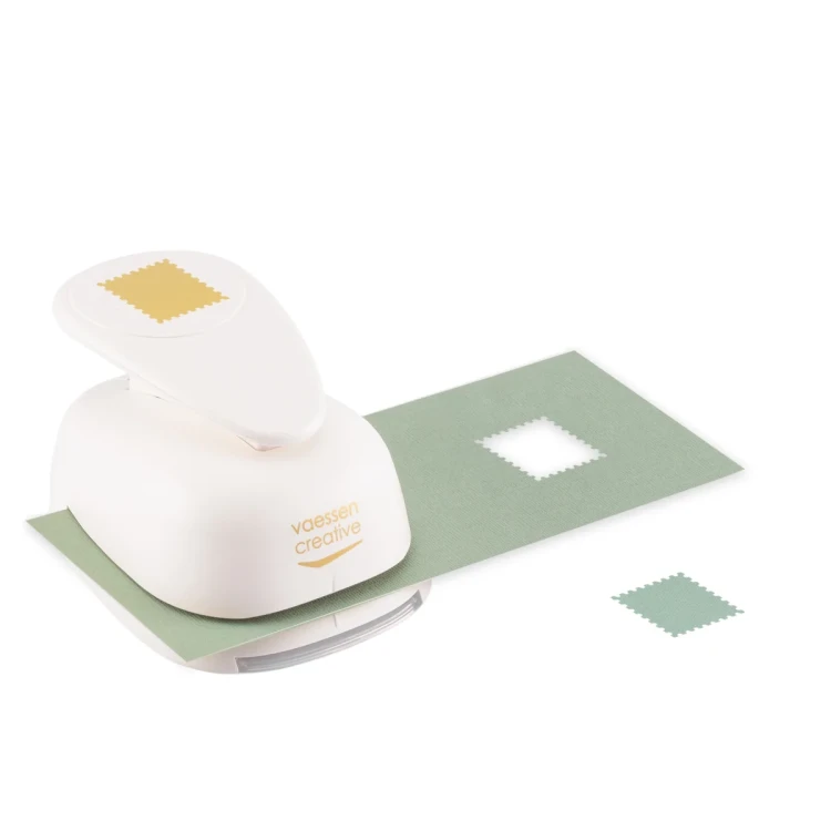 Dziurkacz Jumbo+ Znaczek Pocztowy marki Vaessen Creative pozwala jednym ruchem wyciąć z papieru kształt nawiązujący do klasycznego znaczka pocztowego – kwadrat 4,5 × 4,5 cm z drobno ząbkowanymi krawędziami. Efekt jest czysty i powtarzalny, co sprawia, że każda praca rękodzielnicza zyskuje spójny, dopracowany charakter.