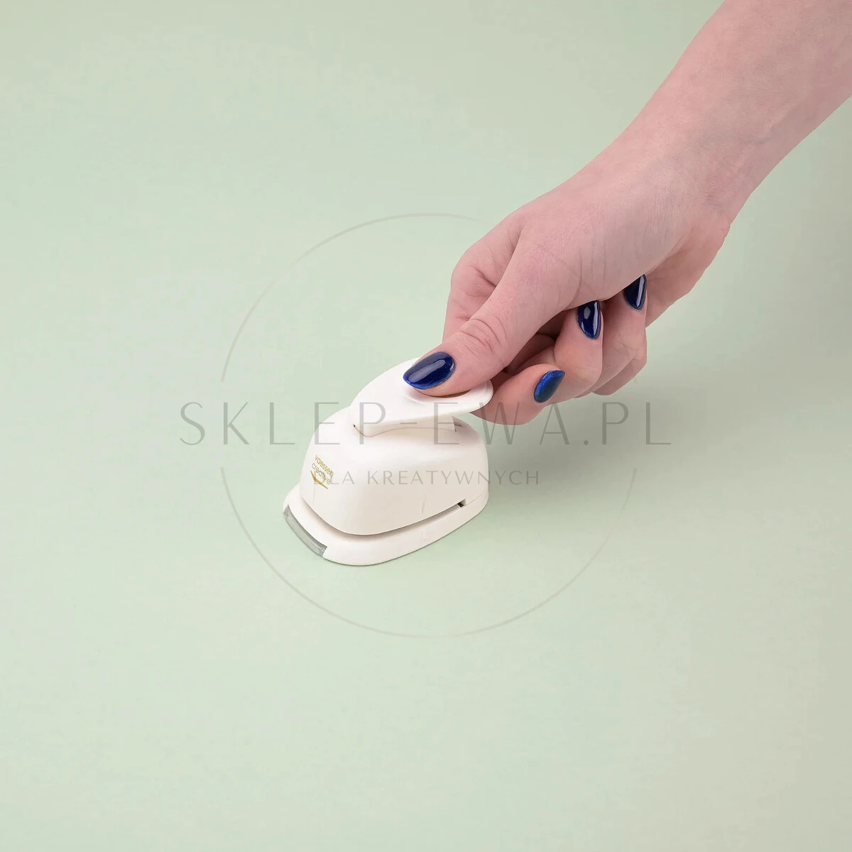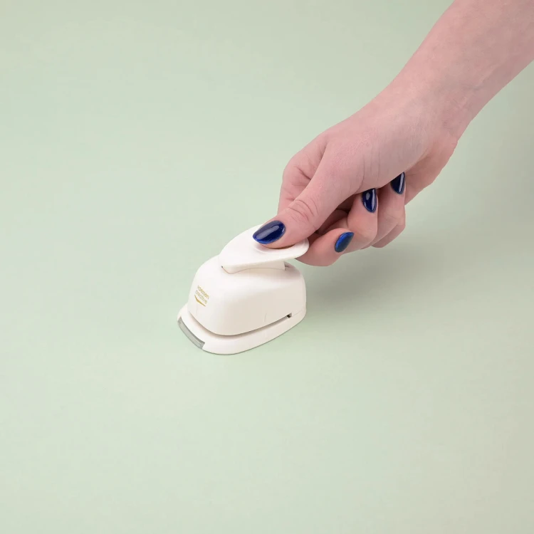 Podczas pracy trzymaj dziurkacz oparty na blacie – to zapewnia równomierny docisk i precyzyjne cięcie. Wsuń materiał do otworu prowadzącego i naciśnij dźwignię. Gotowy wycięty znaczek możesz od razu przykleić do projektu, a pozostała ramka z otworem posłuży jako maska lub szablon – przydatna przy inkowania, sprayowania tła czy technikach mixed media.