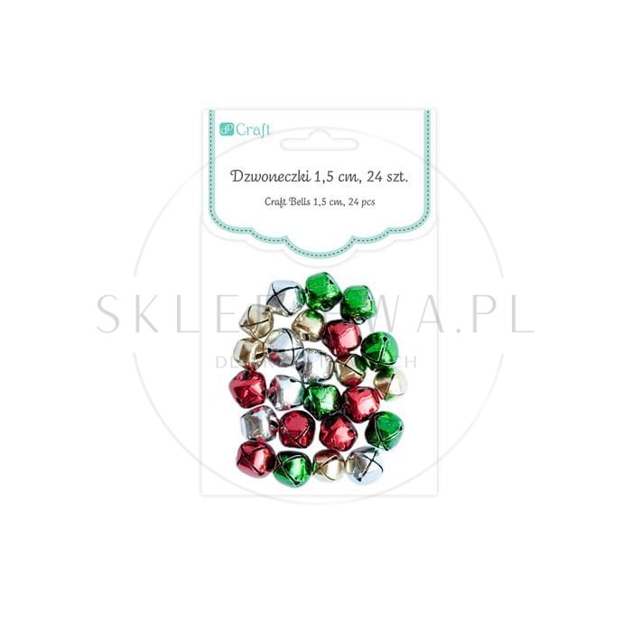 Metalowe dzwoneczki w postaci zawieszek doskonałe do tworzenia ciekawych ozdób choinkowych, dekoracji bożonarodzeniowych itp. Dzwonki w kolorze złotym, srebrnym, czerwonym i zielonym. Średnica 15 mm w opakowaniu 24 sztuk, pięknie dzwonią.