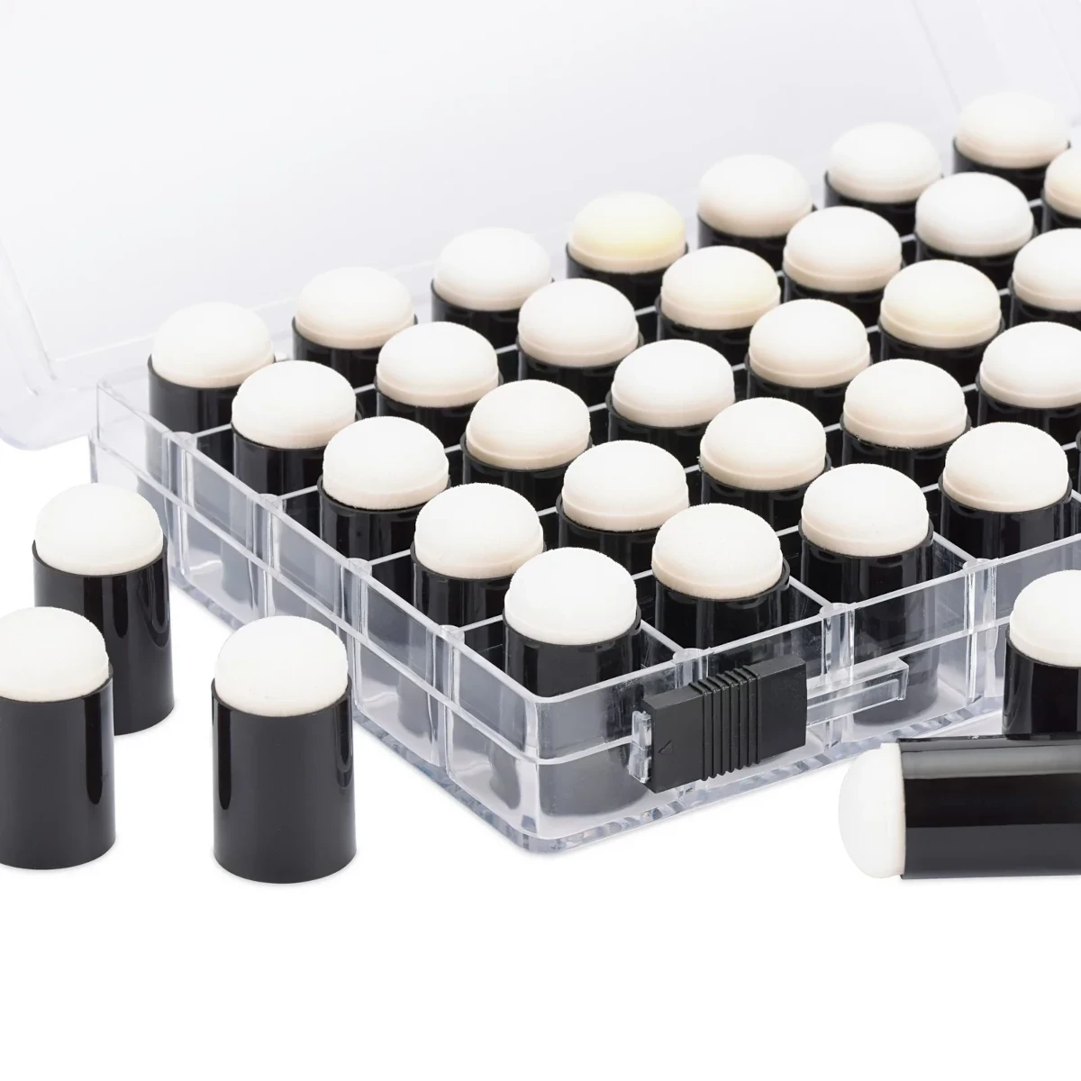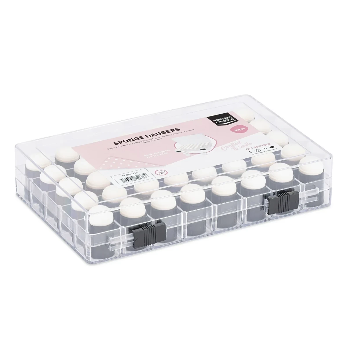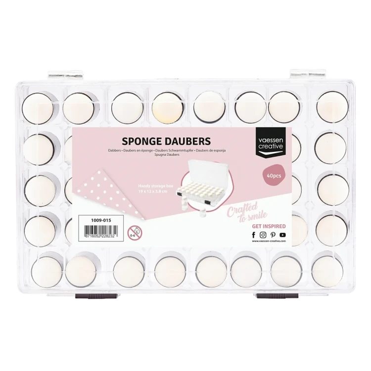 Gąbki aplikatory okrągłe Vaessen Creative, średnica 1,5 cm, zestaw 40 sztuk w praktycznym pudełku. Idealne do precyzyjnego nakładania tuszy, farb i klejów. Wielorazowego użytku.