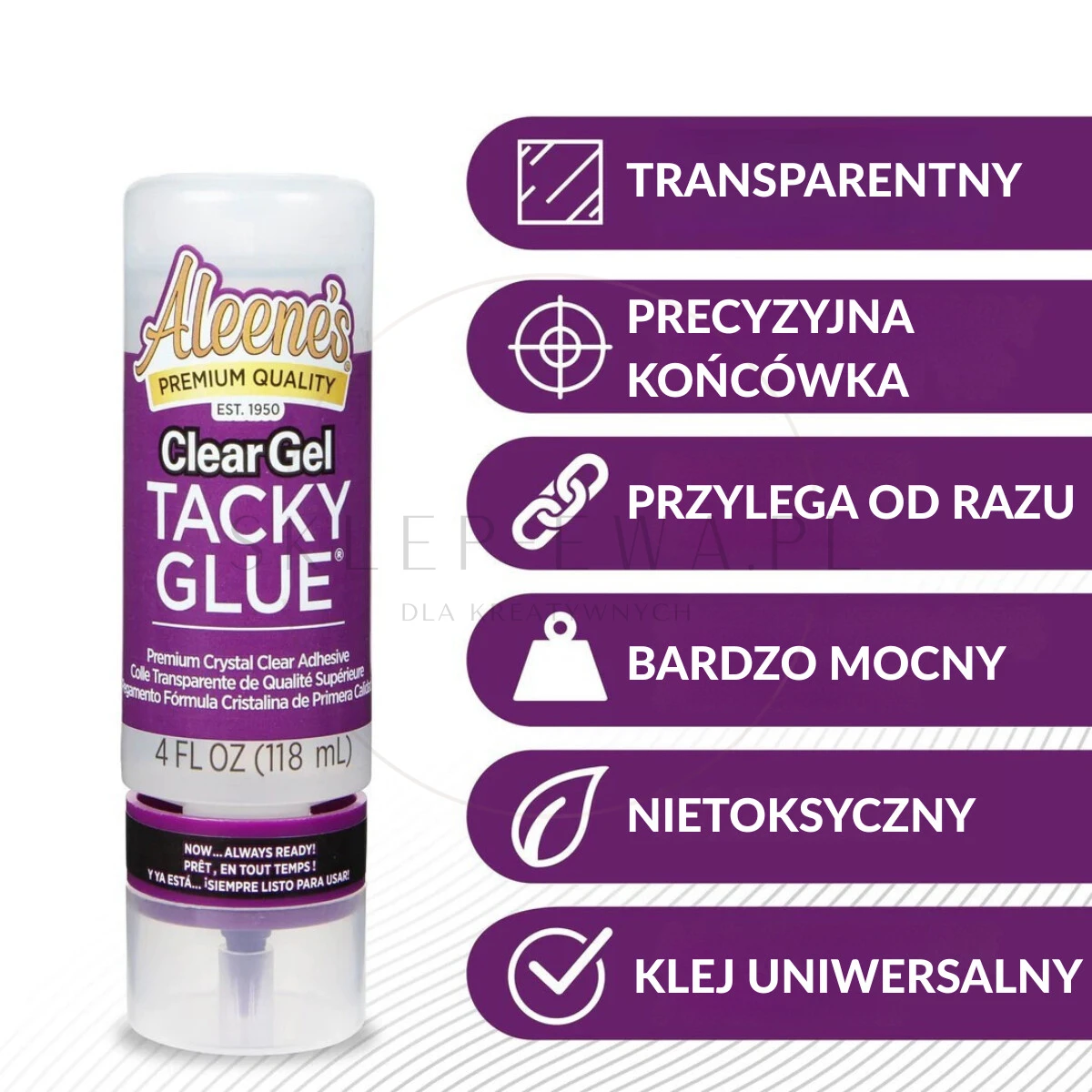 Klej w żelu Aleene's Clear Gel Tacky Glue Always Ready 118 ml to uniwersalny klej do rękodzieła, którego innowacyjna butelka pozwala na przechowywanie go dnem do góry. Dzięki temu gęsty, przezroczysty żel jest zawsze gotowy do użycia, co eliminuje konieczność wstrząsania i czekania na spłynięcie kleju. Idealnie sprawdza się przy precyzyjnym klejeniu papieru, koralików, dżetów i brokatu.