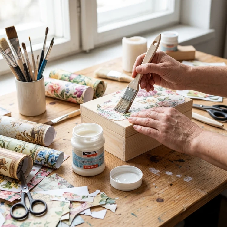 Klej rozprowadza się łatwo i równomiernie. Użyj go pod papier ryżowy, serwetki lub papier do decoupage, a następnie nałóż także warstwę na wierzch projektu. W przypadku zwykłego papieru zaleca się jego wcześniejsze namoczenie, aby uzyskać lepszy efekt. Aplikuj preparat pędzlem, przesuwając od środka ku brzegom, aby usunąć ewentualne pęcherzyki powietrza.