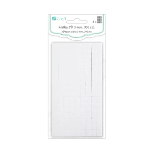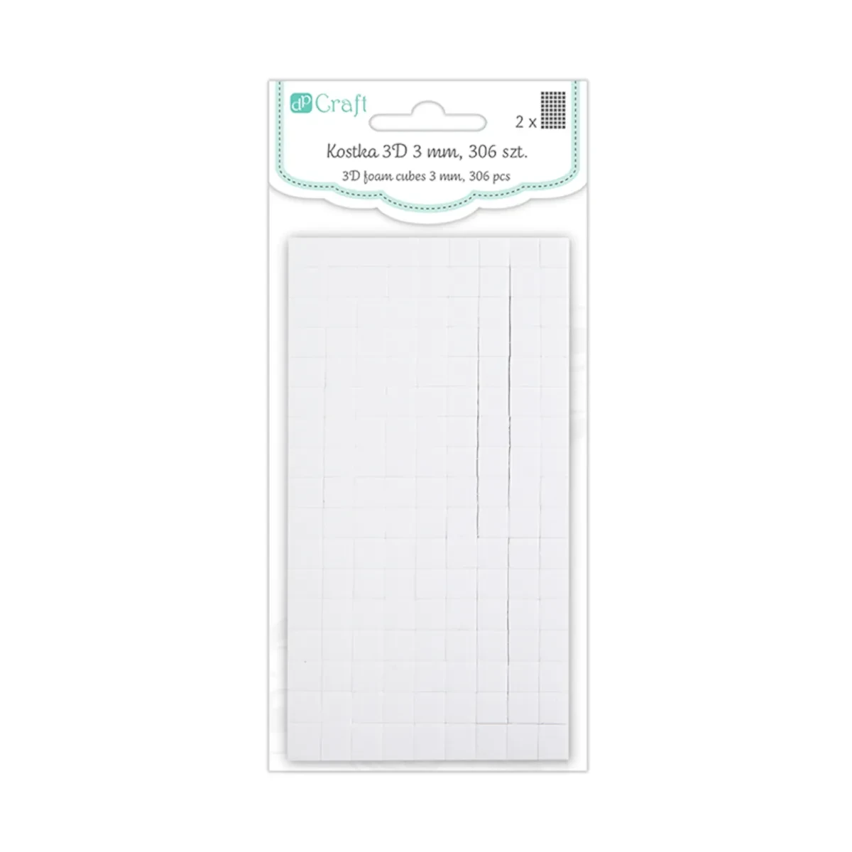 Dwustronnie klejące kostki z pianki o wymiarach 7 x 7 mm i grubości 3 mm ułatwiają szybkie montowanie drobnych ozdób, nadając pracom wyraźny efekt 3D. W opakowaniu znajdują się 2 arkusze, łącznie 306 sztuk.