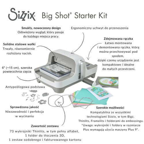 Sama maszynka to tylko urządzenie. Potrzebujesz jeszcze narzędzi, czyli wykrojników i folderów. Jeżeli kupujesz zestaw startowy, to jakieś masz już w pudełku. Zobacz w opisie produktu, co wchodzi w jego skład. Do wersji solowej sama wybierzesz jakie wzory najbardziej Ci się przydadzą. Zwracaj tylko uwagę, by wykrojniki były kompatybilne z Twoim urządzeniem. Zwłaszcza jeżeli chodzi o rozmiar.