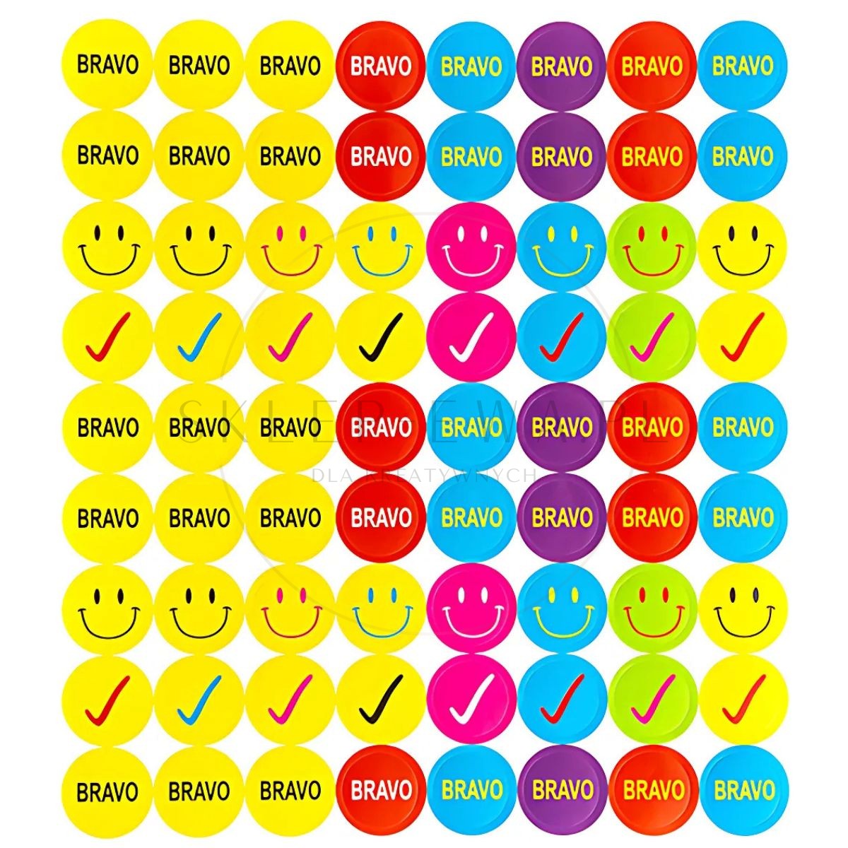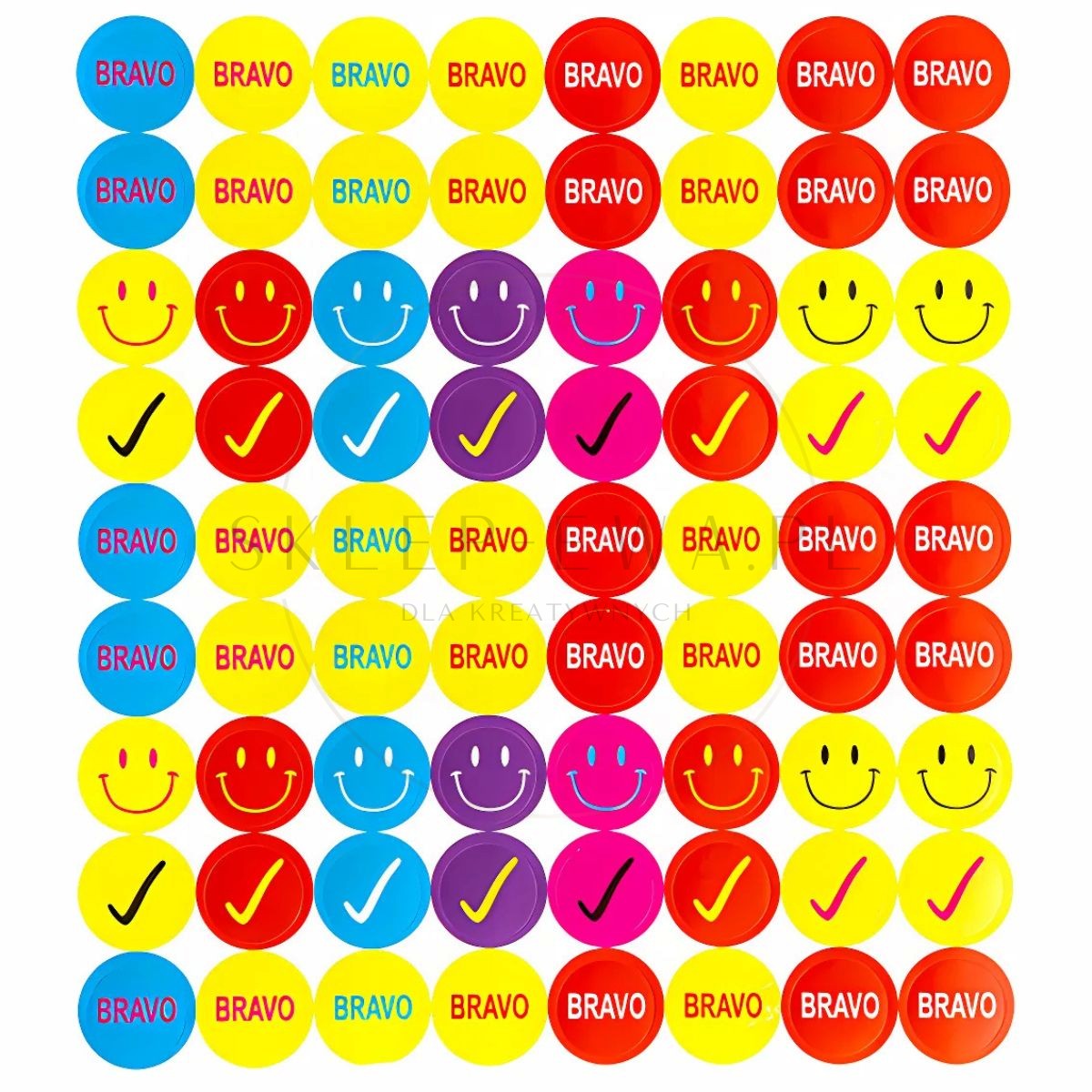 - różnorodne kolory i wzory, w tym buźki oraz napisy typu „brawo”,