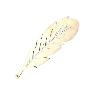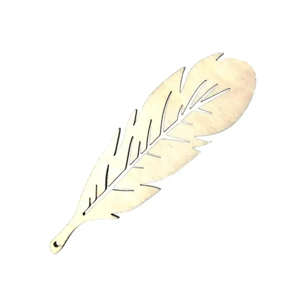 Wycięte w sklejce piórko. Często wykorzystywane do tworzenia łapaczy snów. Posiada otwór do umożliwiający latwe przymocowanie.