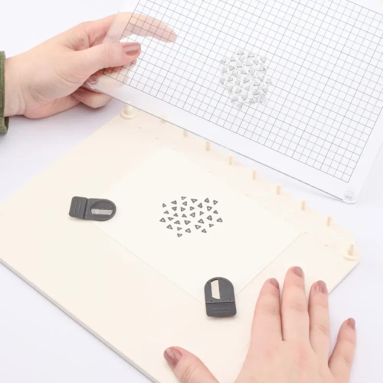 Platforma ta wyposażona jest w dużą, przezroczystą płytkę do stemplowania, którą można zdjąć z platformy i wykorzystać jako blok akrylowy. Dzięki temu możliwe jest wygodne i precyzyjne umieszczanie stempli na dowolnym materiale. Dodatkowo jest ona w pełni magnetyczna i ma antypoślizgową powierzchnię, co zapewnia stabilne ułożenie narzędzia podczas stemplowania. Do dyspozycji masz także mniejszą płytkę.