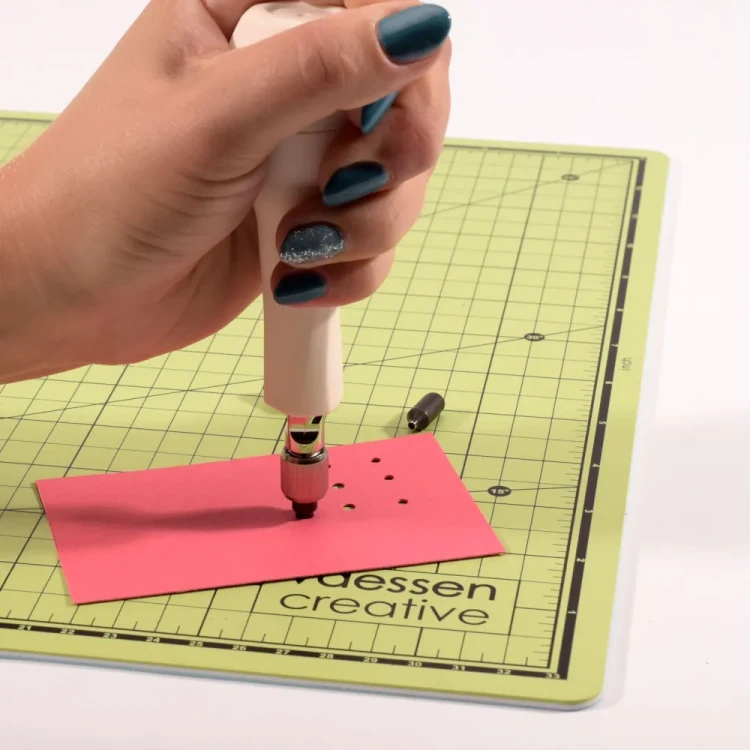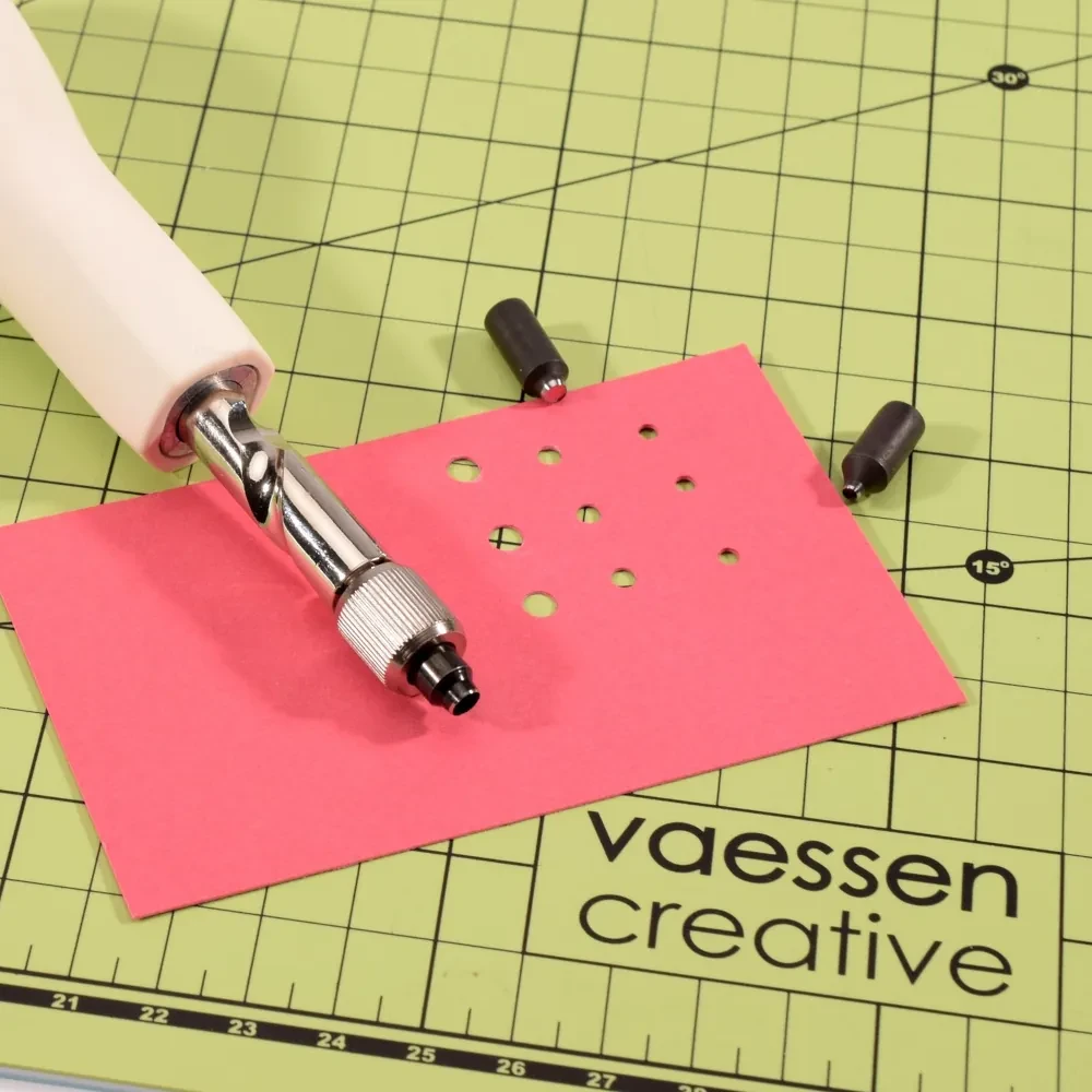Przyrząd ma trzy końcówki robocze umożliwiające wykonanie otworów o średnicy 2, 3 i 4 mm. Będziesz je miała zawsze pod ręką. Miejsce do ich przechowywania jest w rączce. Ich wymiana nie jest kłopotliwa. Pamiętaj, by zawsze używać przyrządu na podkładzie z maty samogojącej.