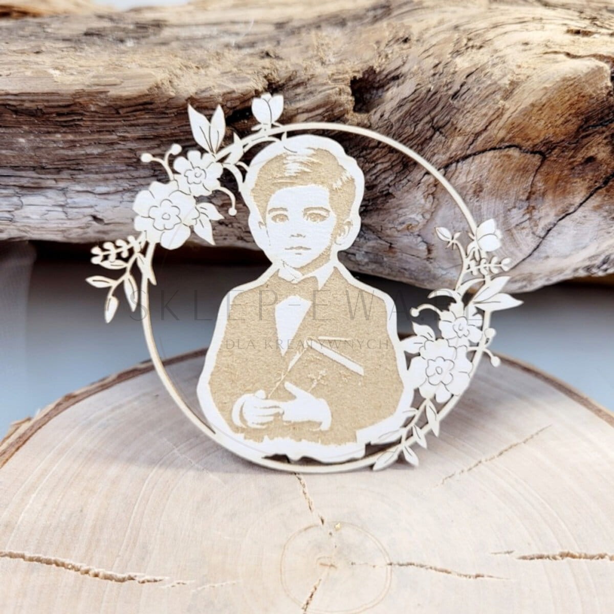- Wzór: ramka z motywem różyczek i grawerowanym wizerunkiem chłopca w stroju komunijnym
