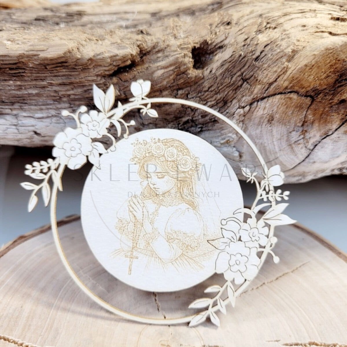 - Wzór: kwiatowa ramka z grawerowanym wizerunkiem dziewczynki w sukience komunijnej