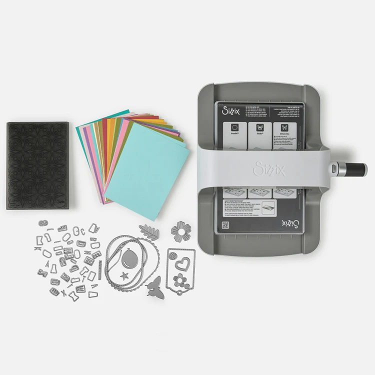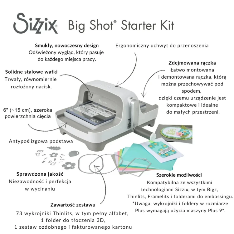 Nowa odsłona Sizzix Big Shot A5 zachwyca eleganckim, współczesnym wzornictwem, które doskonale wpisuje się w estetykę nowoczesnych pracowni kreatywnych. Maszyna obsługuje szerokość do 15 cm (A5) i współpracuje z pełnym zakresem wykrojników i folderów do embossingu Sizzix, w tym Thinlits, Bigz, Framelits. Wersja startowa zawiera wszystko, co potrzebne do rozpoczęcia pracy – od zestawu 73 wykrojników Thinlits po folder 3D do embossingu oraz zestaw kartonów ozdobnych w różnych fakturach i kolorach.
