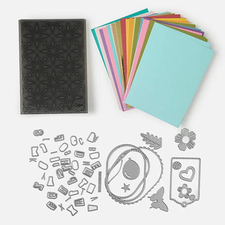 - Zawartość zestawu: 73 wykrojniki Thinlits, 1 folder 3D do embossingu, zestaw kartonów ozdobnych.