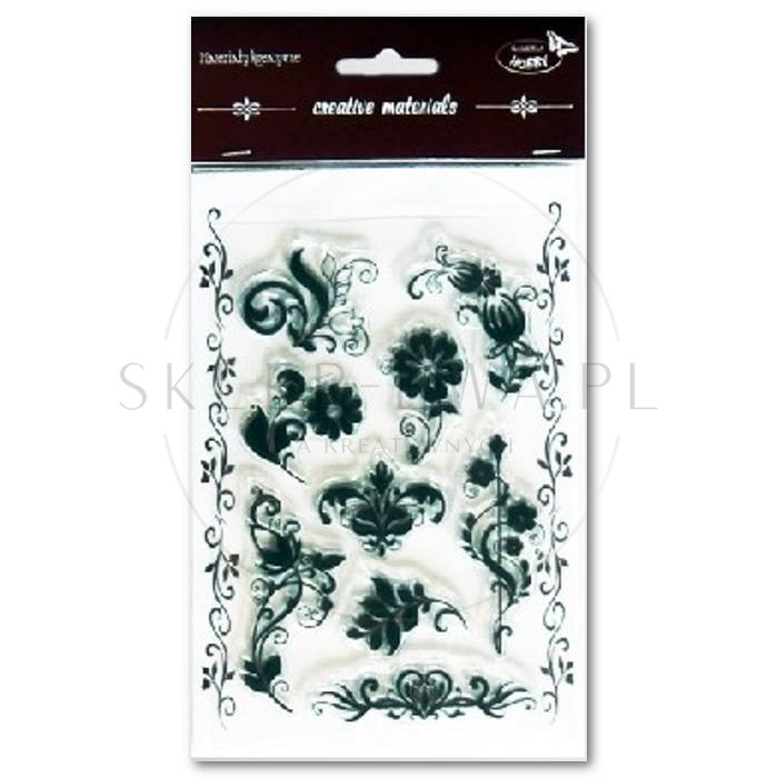 Zestaw 9 silikonowych stempli z kwiatowymi ornamentami. Można dowolnie komponowac je na bloczku akrylowym uzyskując ciekawe kompozycję. Bloczek ułatwia pracę ze stemplami, jest przeźroczysty i bardzo sztywny. Po skończonej pracy stemple należy umyć ciepłą wodą z mydłem lub specjalnym płynem do stempli. Rozmiar stempli od 28x40 mm do 70x35 mm.