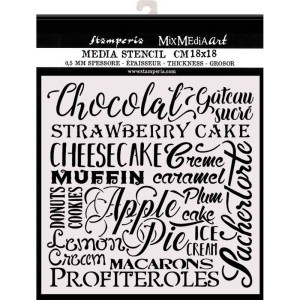 Szablon Stamperia do pracy z farbami, pastami i masami. Wykonana z półprzeźroczystego, elastycznego plastiku o grubości 0,25 mm. Motyw z napisami.