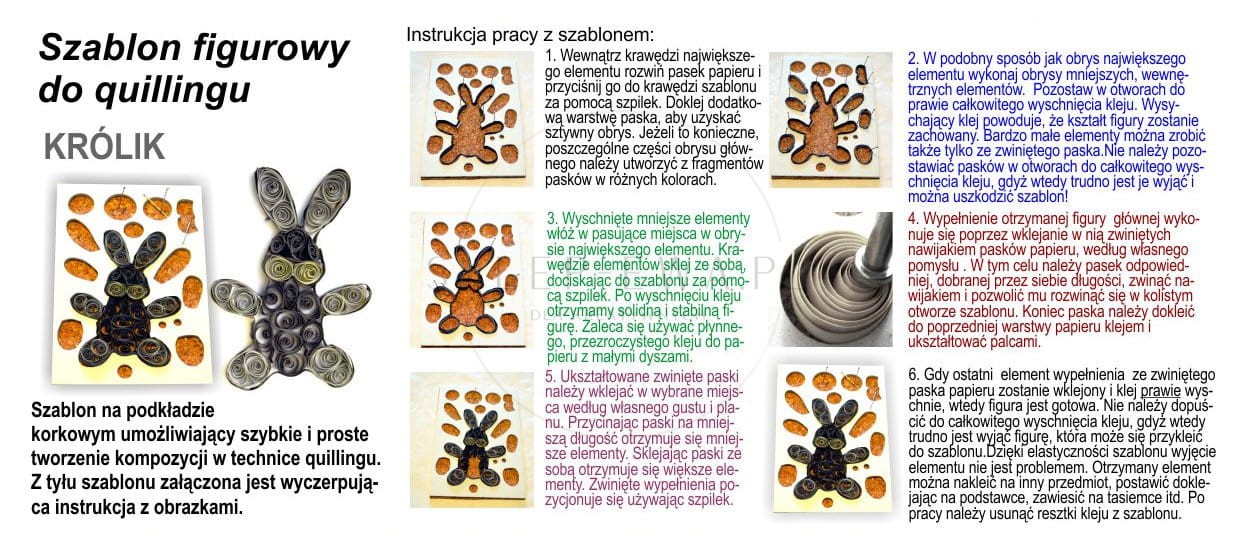 Specjalny szablon na podkładzie korkowym, umożliwiający szybkie i proste tworzenie kompozycji z pasków do quillingu. Do pracy należy wybierać paski do quillingu dobrej jakości, najlepiej gramatury 130. Potrzebny będzie także klej i szpilki.