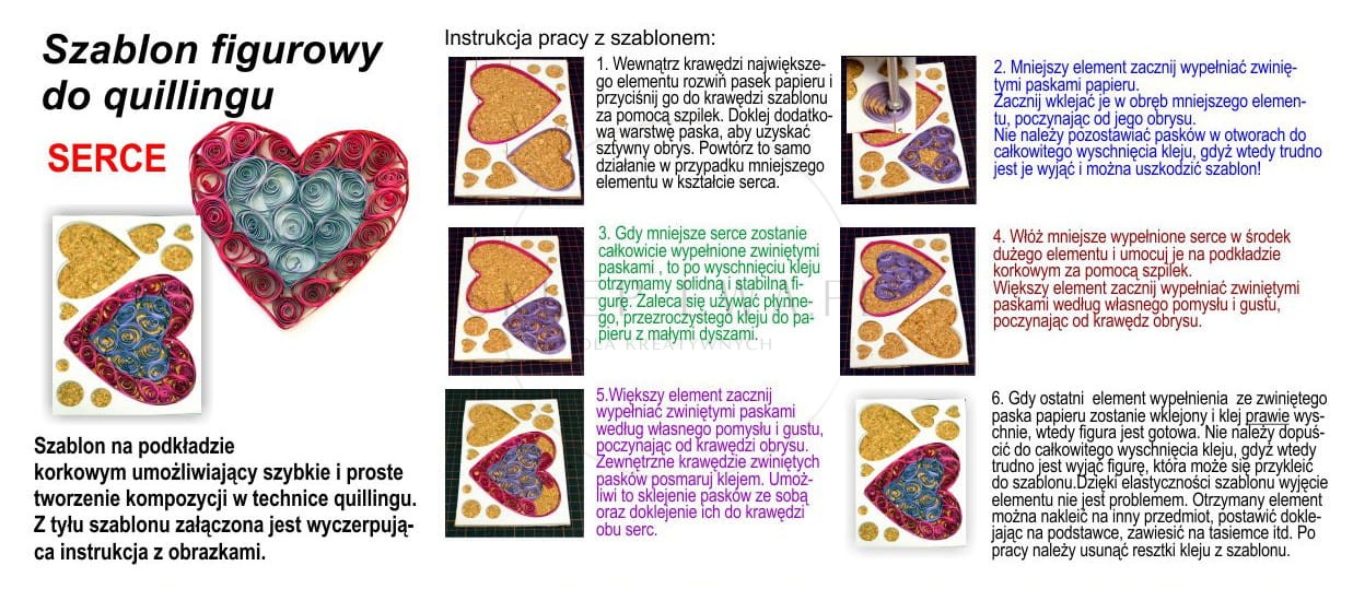 Specjalny szablon na podkładzie korkowym, umożliwiający szybkie i proste tworzenie kompozycji z pasków do quillingu. Do pracy należy wybierać paski do quillingu dobrej jakości, najlepiej gramatury 130. Potrzebny będzie także klej i szpilki.