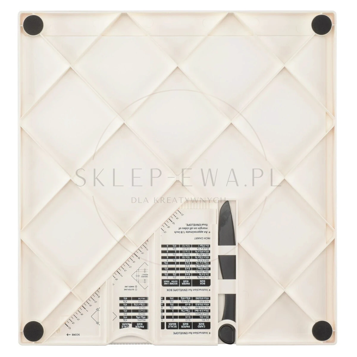 Zestaw został zaprojektowany tak, aby wszystko było pod ręką. W komplecie znajdziesz kostkę do bigowania (bone folder) oraz linijkę trójkątną z instrukcją, która krok po kroku poprowadzi Cię przez proces tworzenia kopert. Wszystkie dodatki po skończonej pracy możesz wygodnie schować w specjalnym schowku z tyłu urządzenia, co ułatwia utrzymanie porządku na biurku.