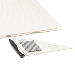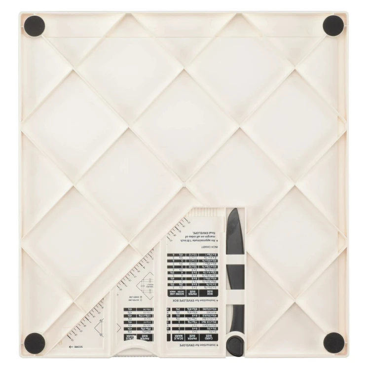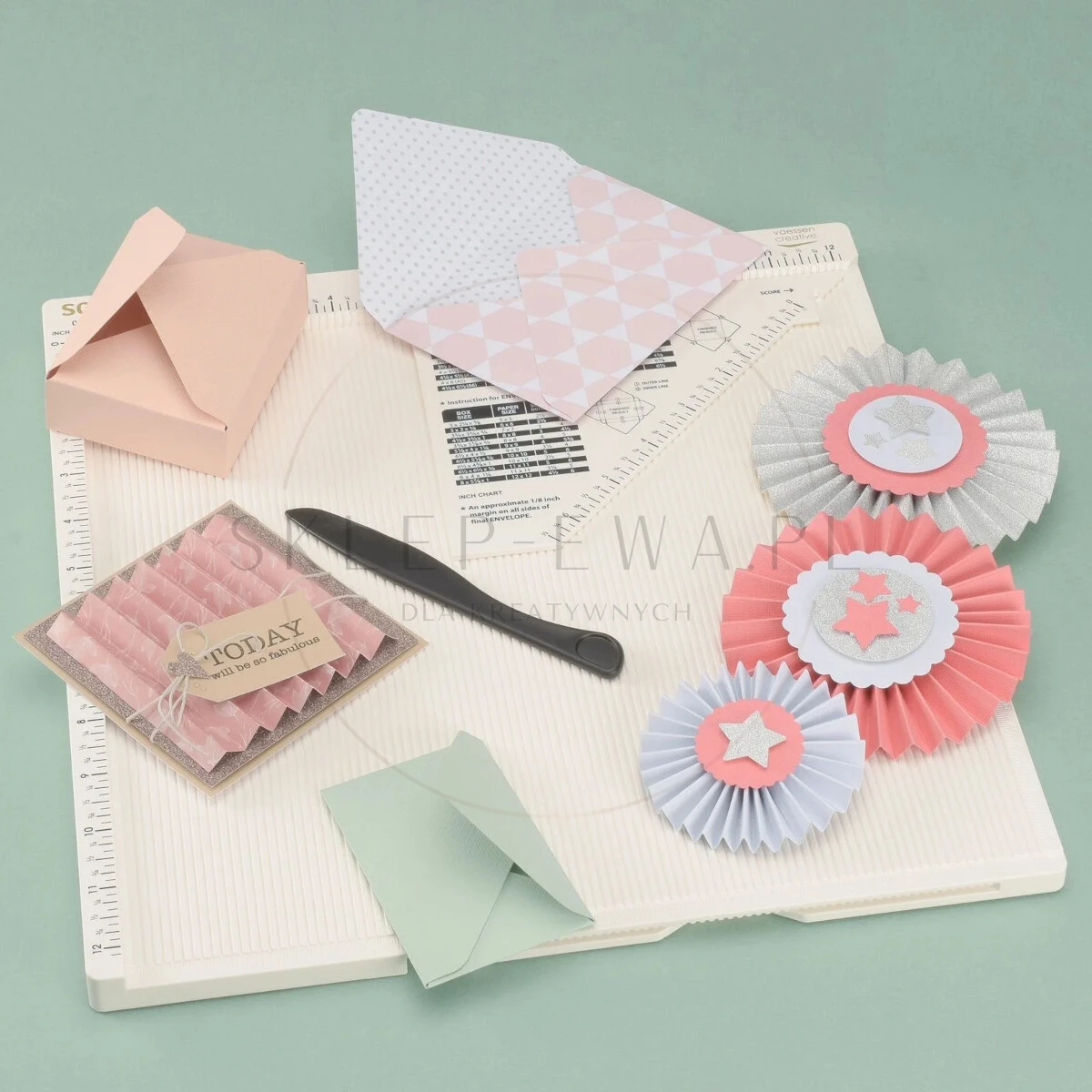 Praca z tablicą jest intuicyjna. Wystarczy położyć papier na powierzchni roboczej, docisnąć go do krawędzi i używając dołączonej kostki, przesunąć po wybranym rowku. Aby stworzyć kopertę, skorzystaj z dołączonej linijki trójkątnej – ustaw papier pod odpowiednim kątem według instrukcji, zrób bigowanie z czterech stron i gotowe! Twoje projekty będą od teraz idealnie równe i powtarzalne.