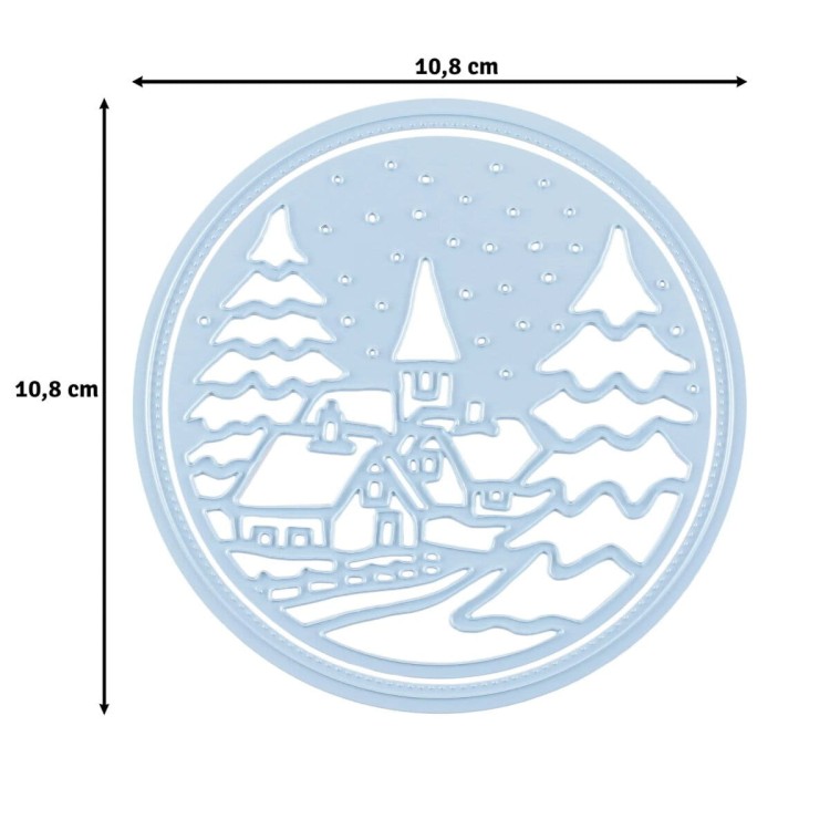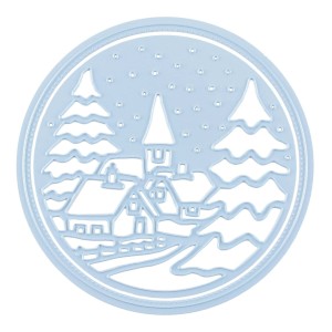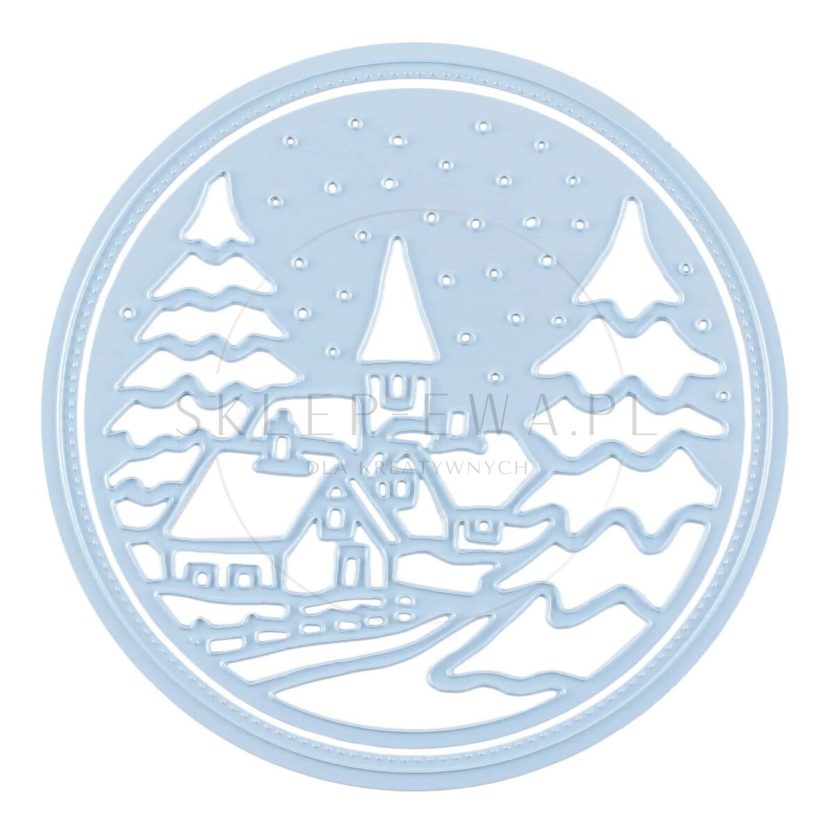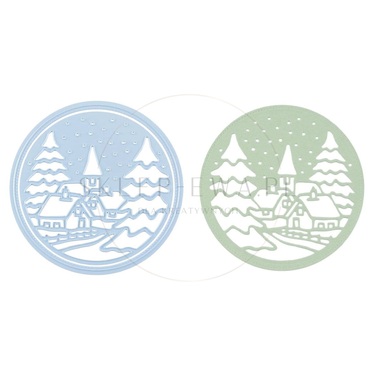 - Motyw: Okrągła ramka z widokiem na zaśnieżoną wioskę.