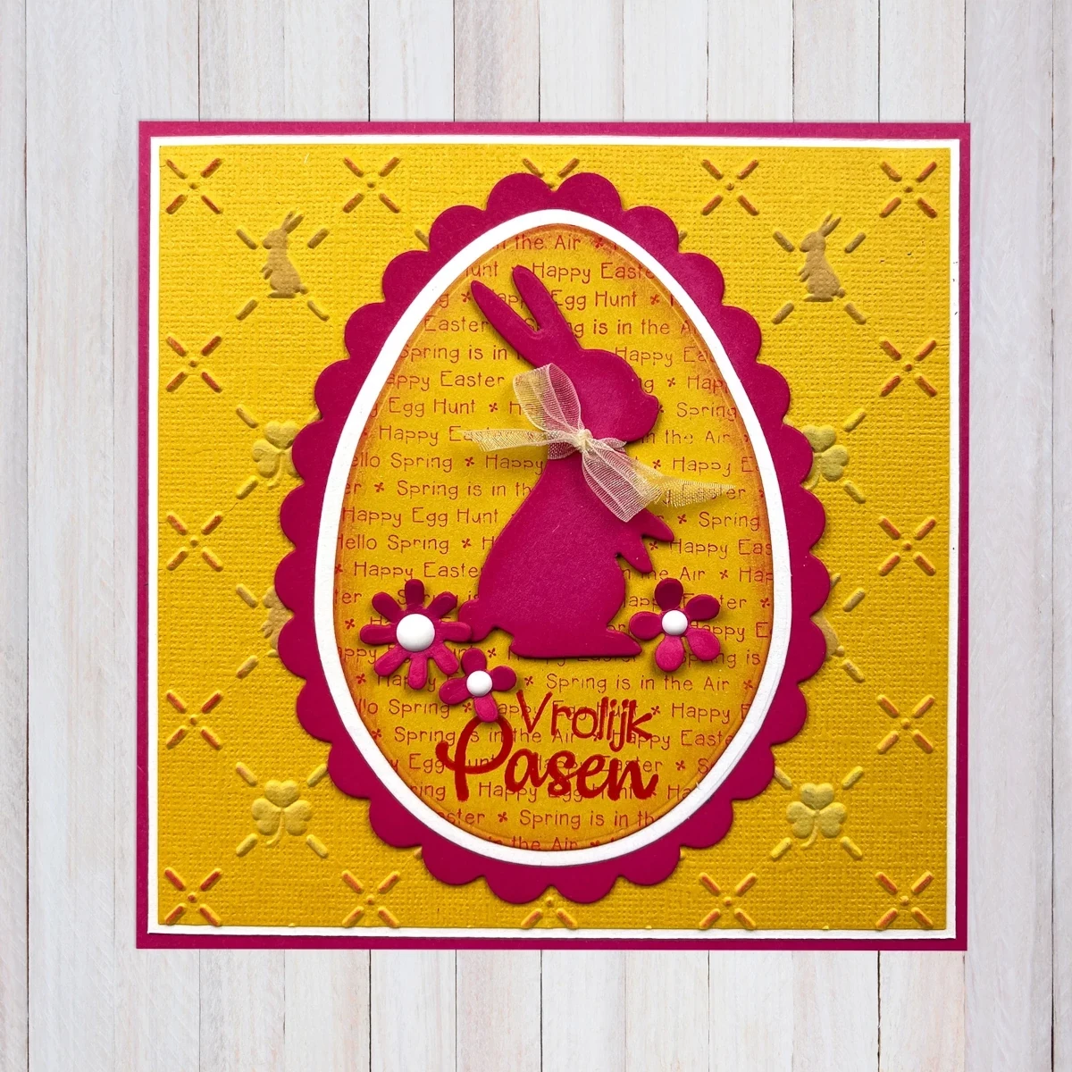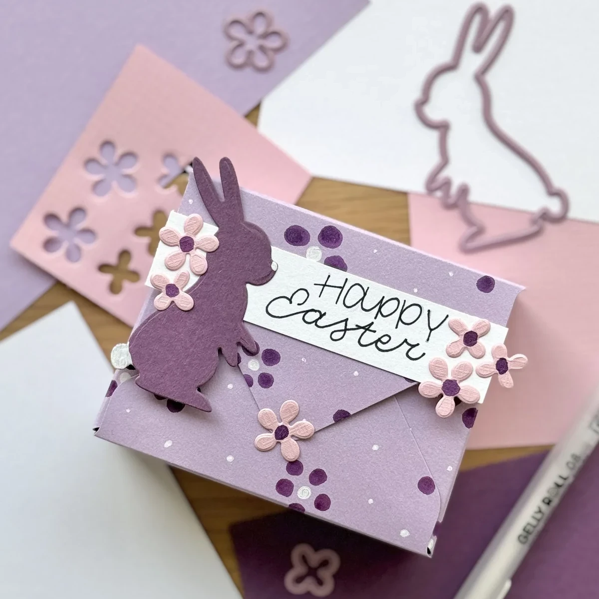 Wskazówka: Aby uzyskać ciekawy efekt 3D, wycinaj poszczególne warstwy ramki z papierów w kontrastujących kolorach lub o różnej strukturze. Elementy możesz przyklejać za pomocą kostek dystansowych, co nada Twojej pracy głębi i sprawi, że zajączek będzie wyglądał, jakby znajdował się wewnątrz ozdobnego okienka.