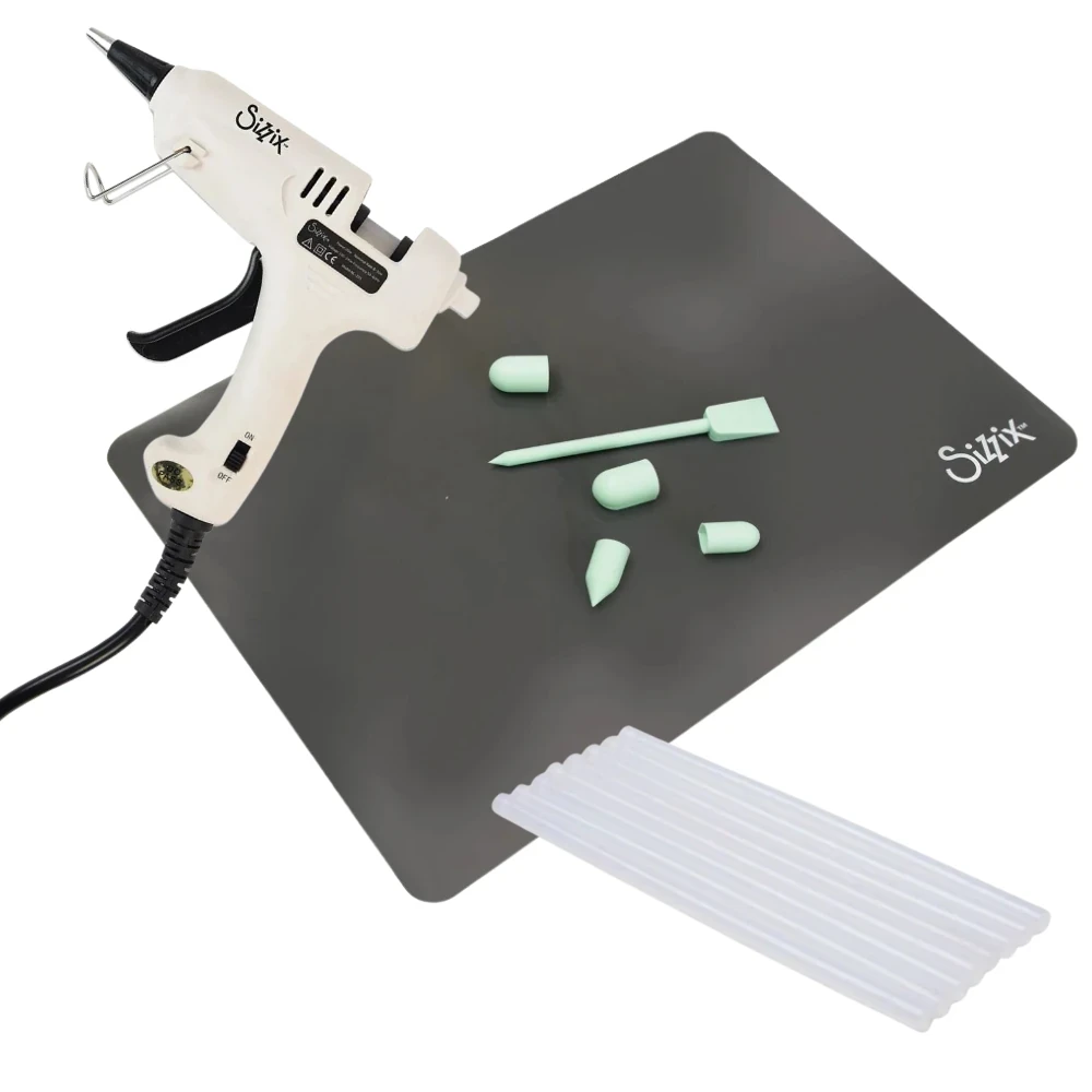 Zestaw do klejenia na gorąco Sizzix, idealny dla każdego miłośnika DIY! Zestaw zawiera wszystko, czego potrzebujesz, aby rozpocząć swoją przygodę z klejeniem na gorąco, zapewniając precyzję i wygodę w pracy.