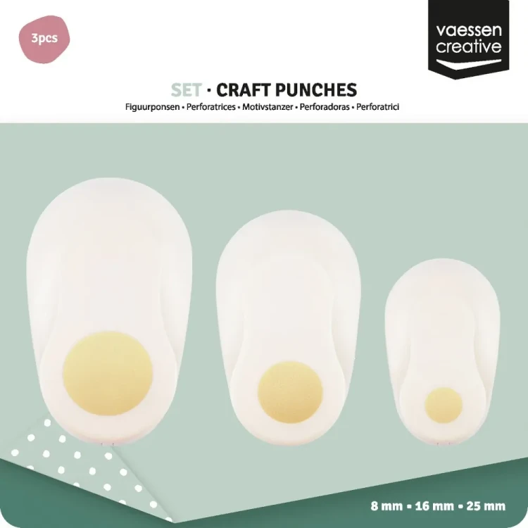 Zestaw trzech dziurkaczy ozdobnych od Vaessen Creative. Co znajdziesz w zestawie? Trzy precyzyjne dziurkacze do wycinania kółek o średnicach 8, 16 i 25 mm. Pomyśl, ile możliwości to otwiera! Od maleńkich, subtelnych akcentów po większe, przykuwające wzrok elementy - wszystko w zasięgu Twojej ręki.
