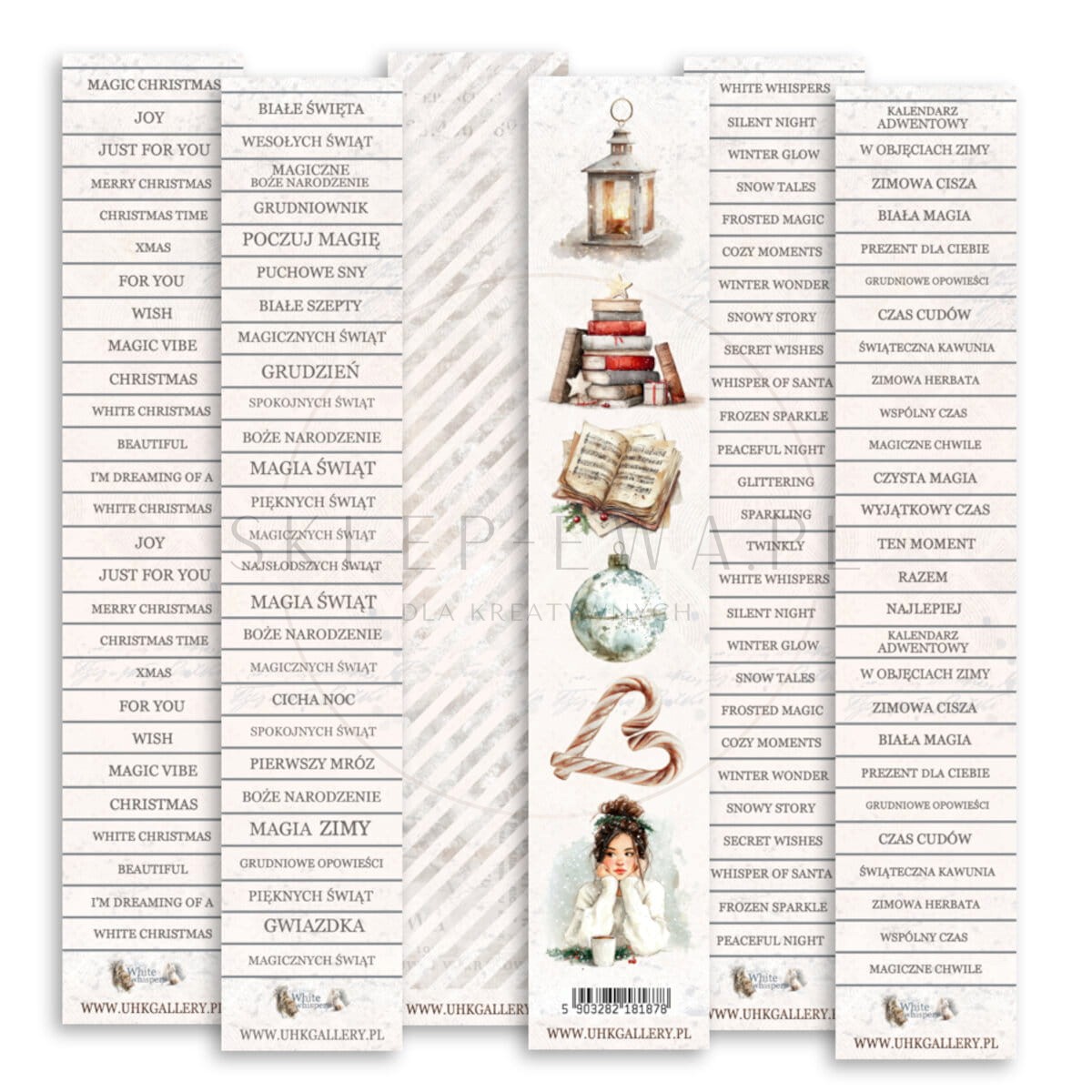 Zestaw White Whispers od UHK Gallery to trzy dwustronne paski pełne delikatnych zimowych motywów i napisów w języku polskim oraz angielskim. Subtelna paleta beży, szarości i śnieżnych bieli tworzy spokojny, magiczny klimat – idealny do świątecznych kartek, albumów i grudniowników.