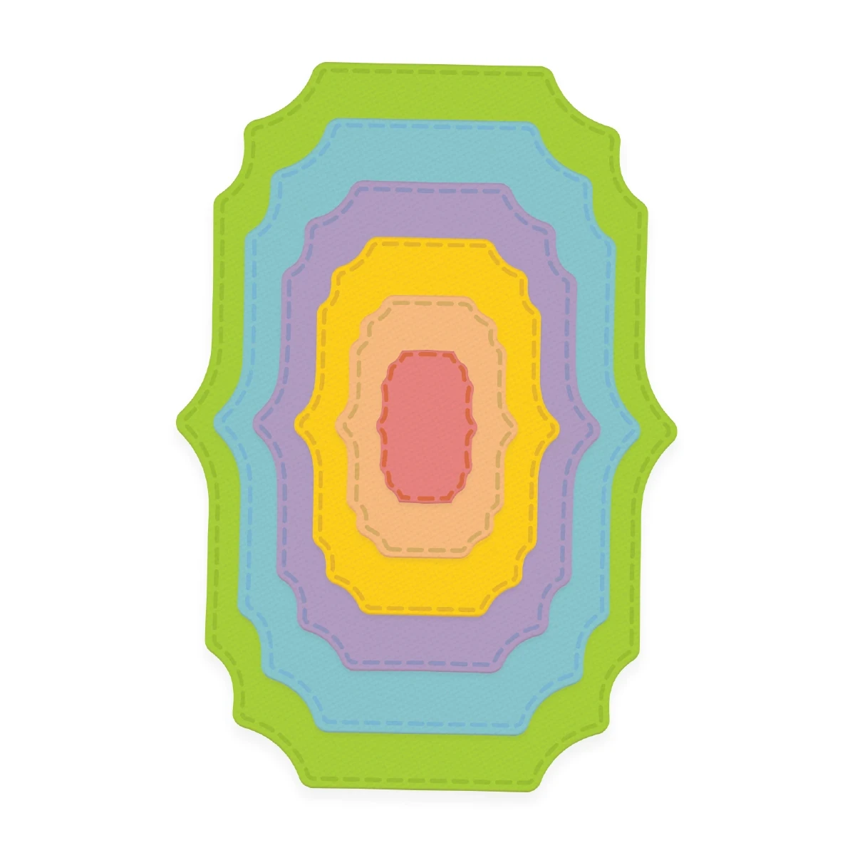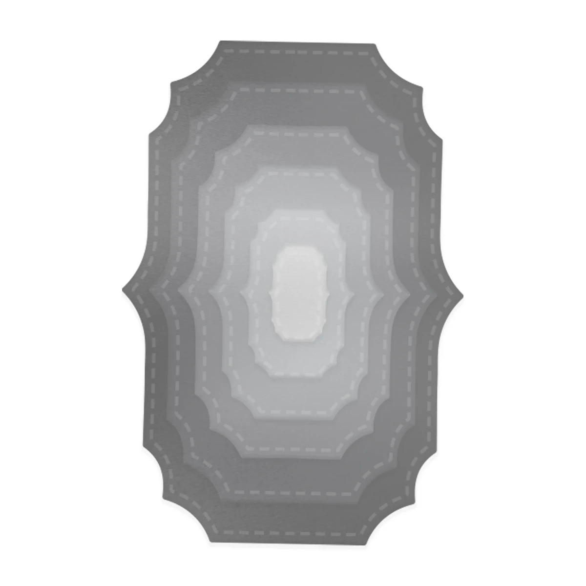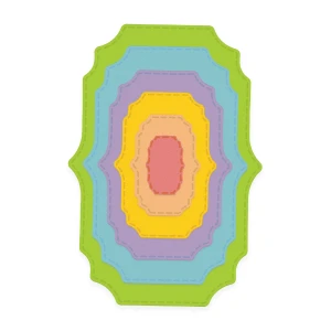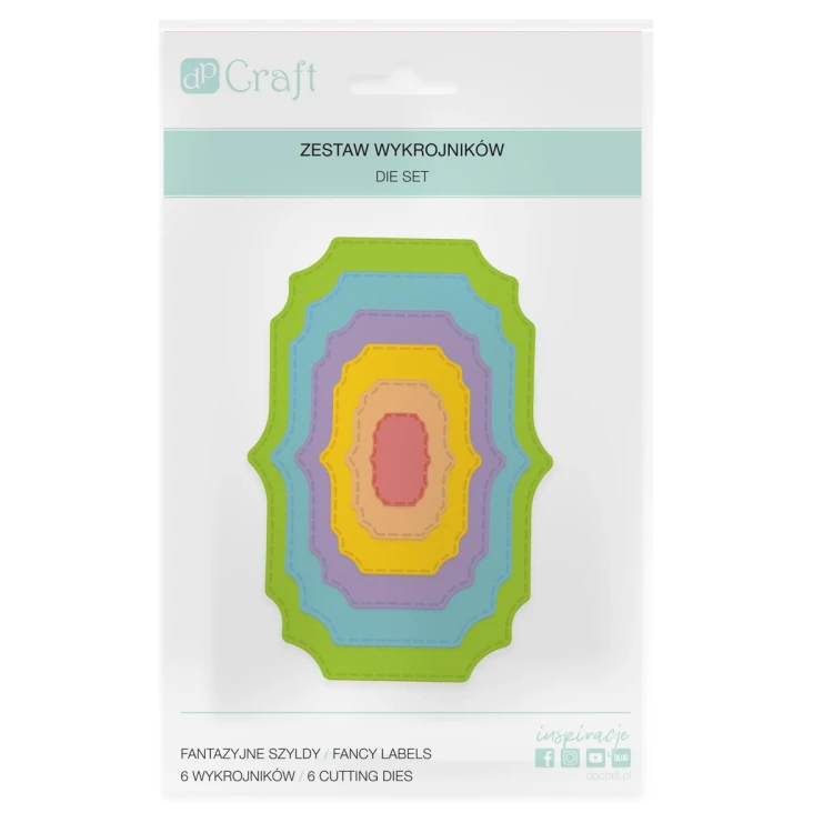 Zestaw wykrojników fantazyjne szyldy zawiera 6 wykrojników w różnych rozmiarach z dekoracyjnymi, pofalowanymi krawędziami. Każdy wykrojnik ma identyczny kształt, ale inny rozmiar, co pozwala na tworzenie wielowarstwowych kompozycji lub wybór idealnego rozmiaru do konkretnego projektu.