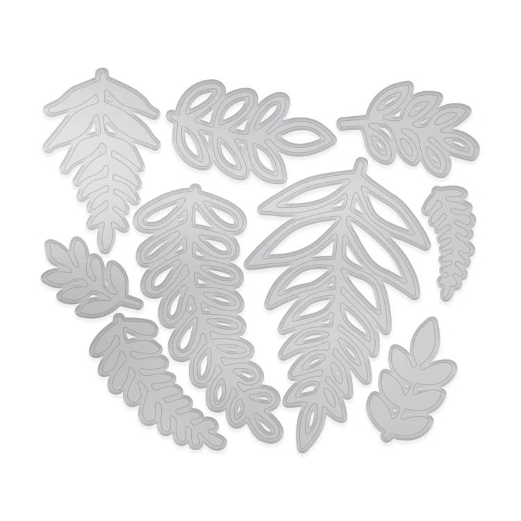 Zestaw wykrojników ozdobne gałązki zawiera 9 różnorodnych wzorów listków i gałązek w różnych rozmiarach, od subtelnych detali po większe elementy dekoracyjne. Wykrojniki pozwalają na precyzyjne wycięcie delikatnych, botanicznych motywów z papieru, tektury i pianki.